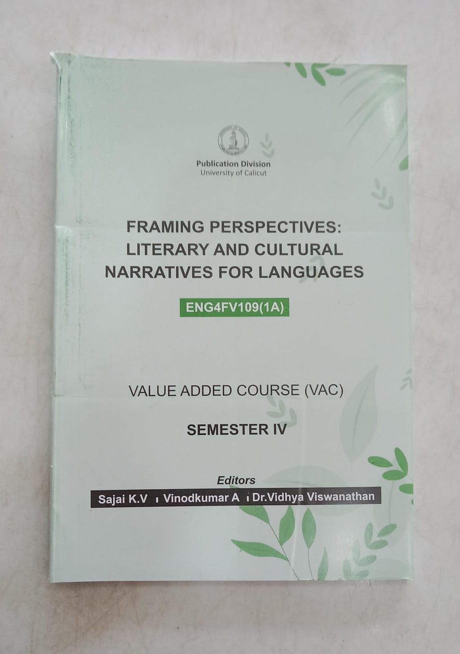 Framing Perspectives: Literary and Cultural Narratives for Languages is a Value Added Course textbook designed to foster ethical awareness, gender sensitivity, inclusiveness, and ecological consciousness through literature and cultural texts. Structured into four modules, the book uses poems, stories, essays, lectures, and visual media to help learners develop global citizenship, critical thinking, and human values essential for a just and sustainable society.